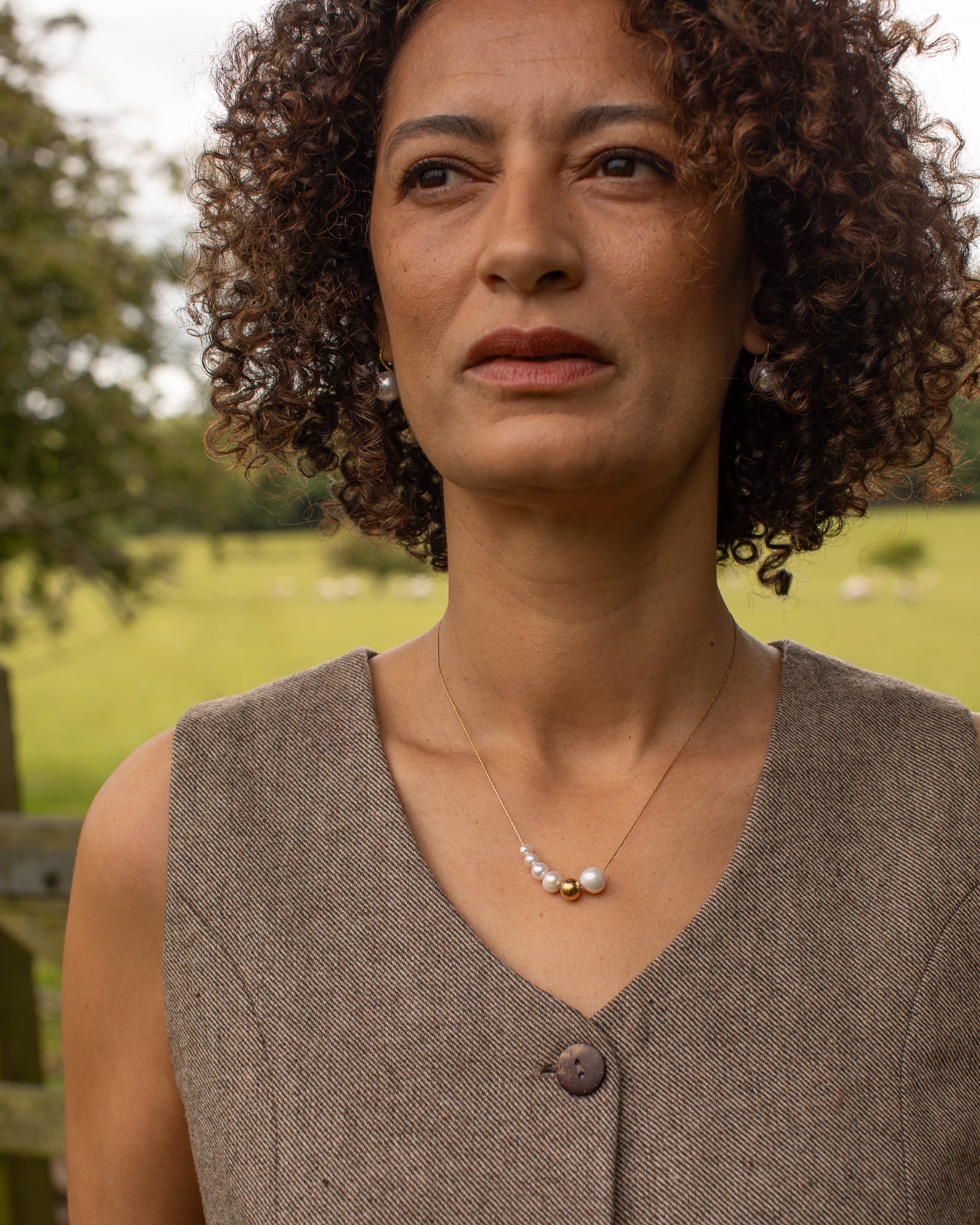 Ashford is a minimalist necklace finished with 5 classic pearl beads all varying in sizes as well as one standalone gold ball bead.
