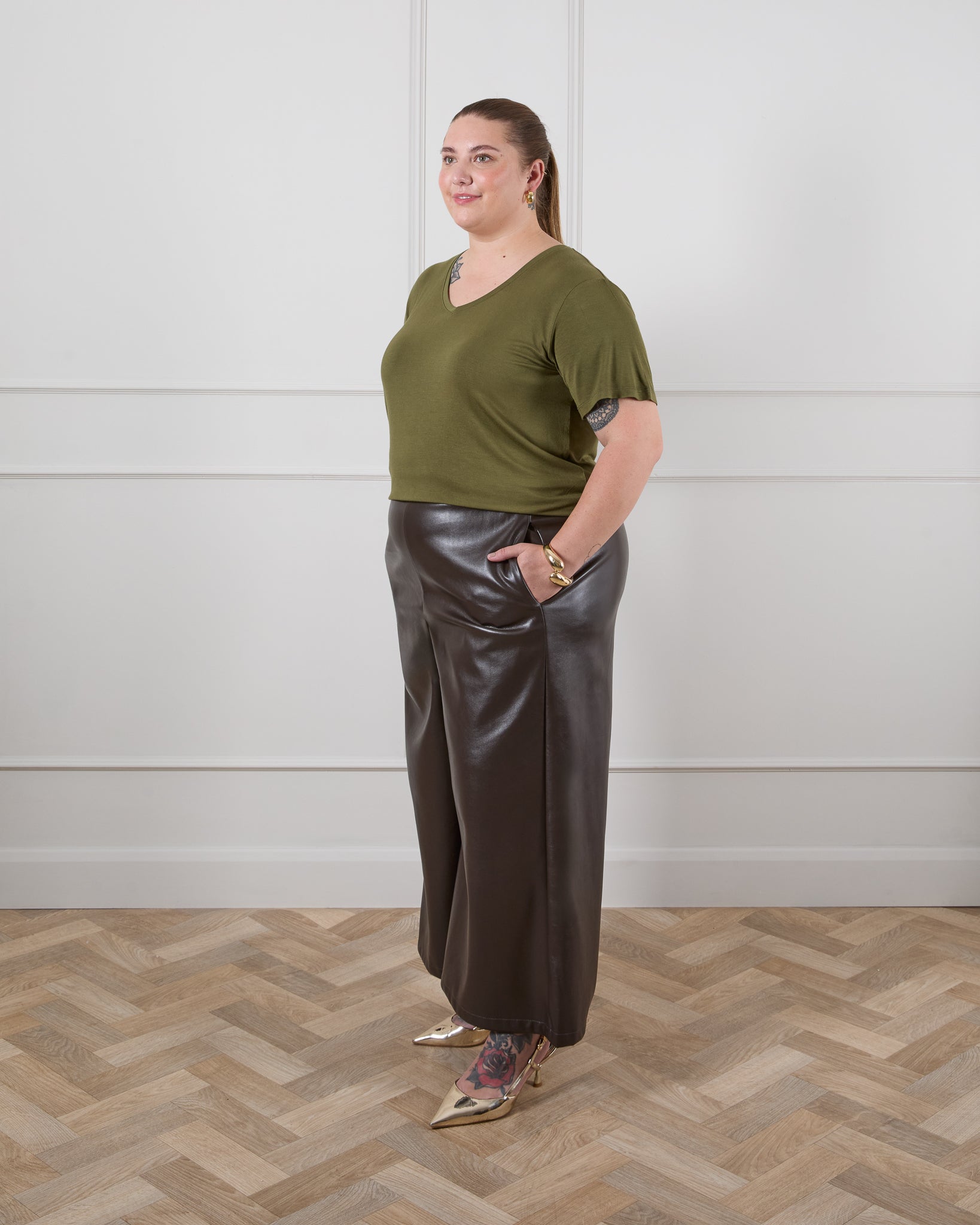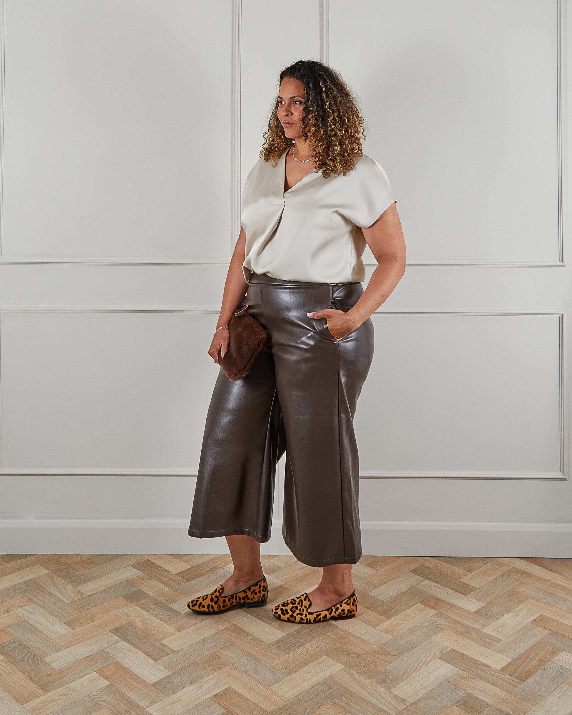 Step up your style game with the Darcy Faux Leather Trousers. Featuring a wide leg and adjustable waist, these trousers are designed for a comfortable and flattering fit. The soft faux leather material adds a touch of luxury, making these a versatile and must-have addition to your wardrobe.