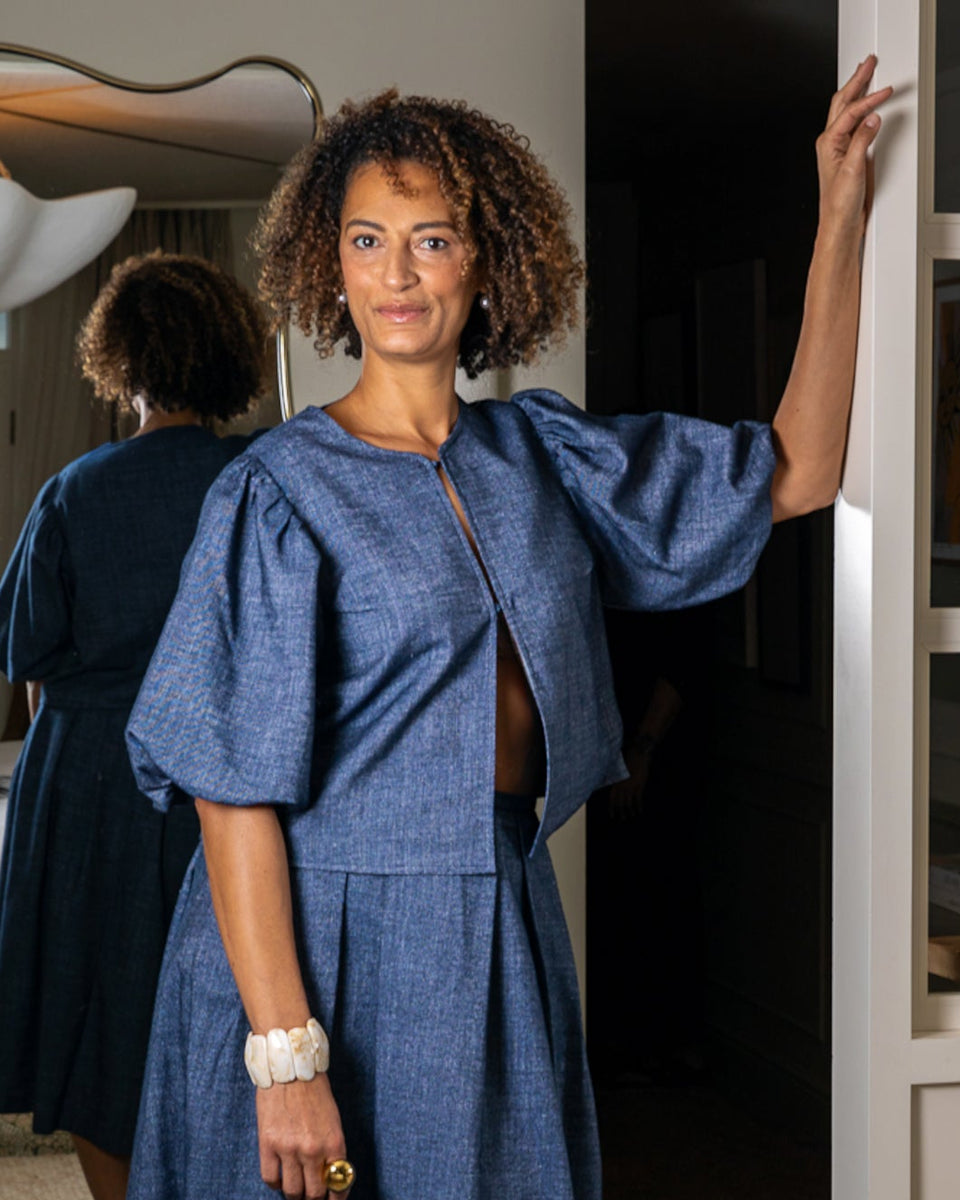 The Jessica Jacket is a cropped, boxy design with statement puff sleeves. Made from soft denim, it features a hook-and-eye closure, allowing you to wear it buttoned up or open for versatile styling.