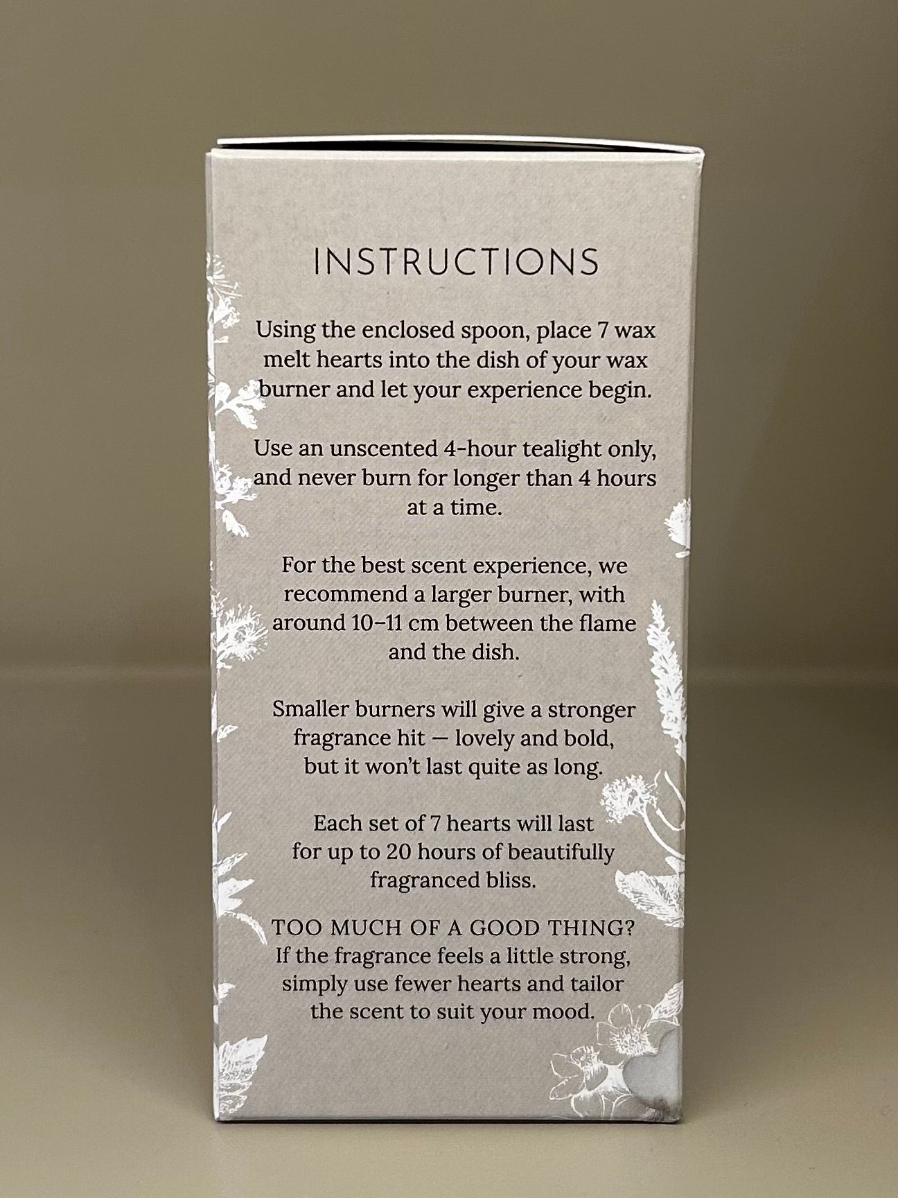 THIS IS NOT A FOOD ITEM DO NOT EAT. If ingested seek immediate medical advice. Keep out of reach of children and pets. Remove all packaging and place the wax melt in a wax melt warmer. Don’t move while lit or use near flammable objects.